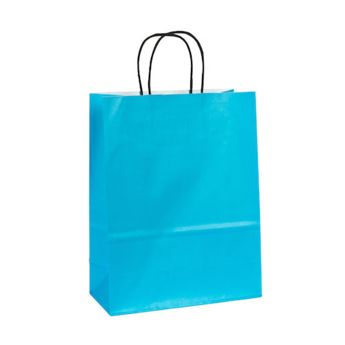 Pappersbärkasse Small blå i storlek 240x110x310mm med handtag av tvinnat papper. Bärkassarna har en extra förstärkt botten och är högkvalitativa. Placera din present, giveaways i en papperspåse och gör den personlig med färg. Marknadsför företaget med en egen kasse i en lämplig färg.